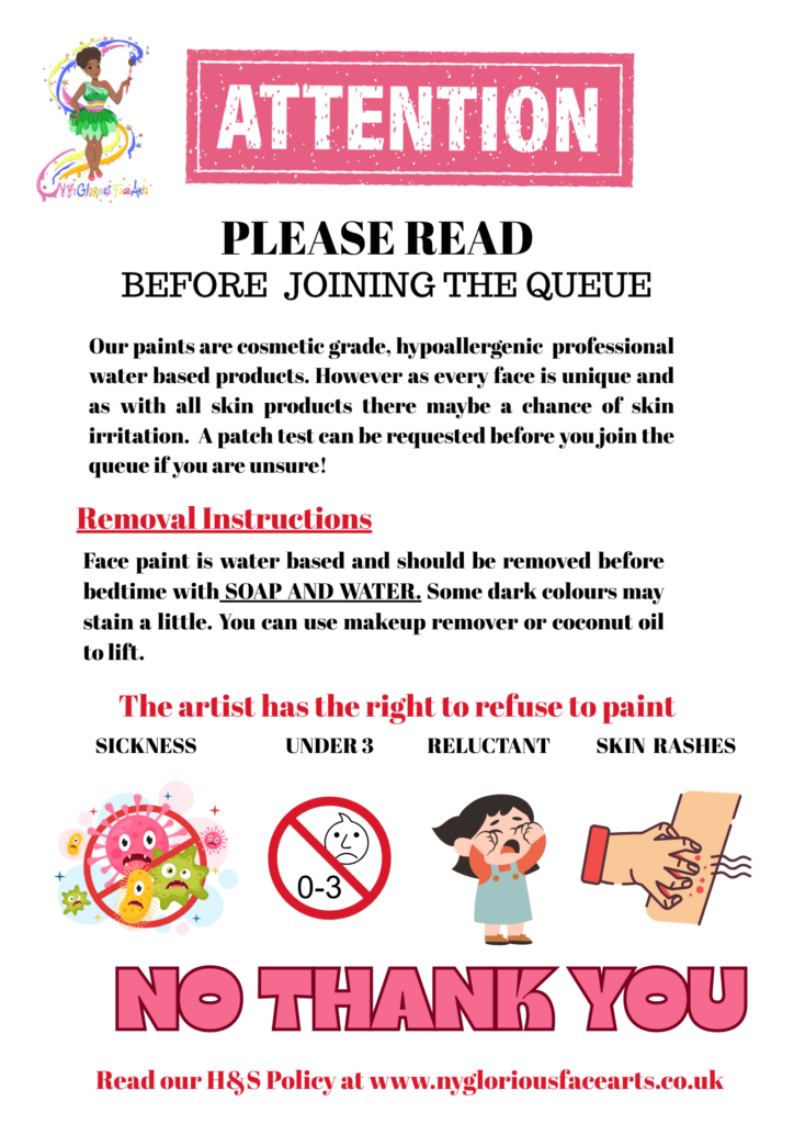 HYGIENE IS PARAMOUNT to avoid cross infection, please ensure participant’s mouths and noses are wiped and face is CLEAN and DRY before being seated for painting. Read below for reasons why people should not participate.